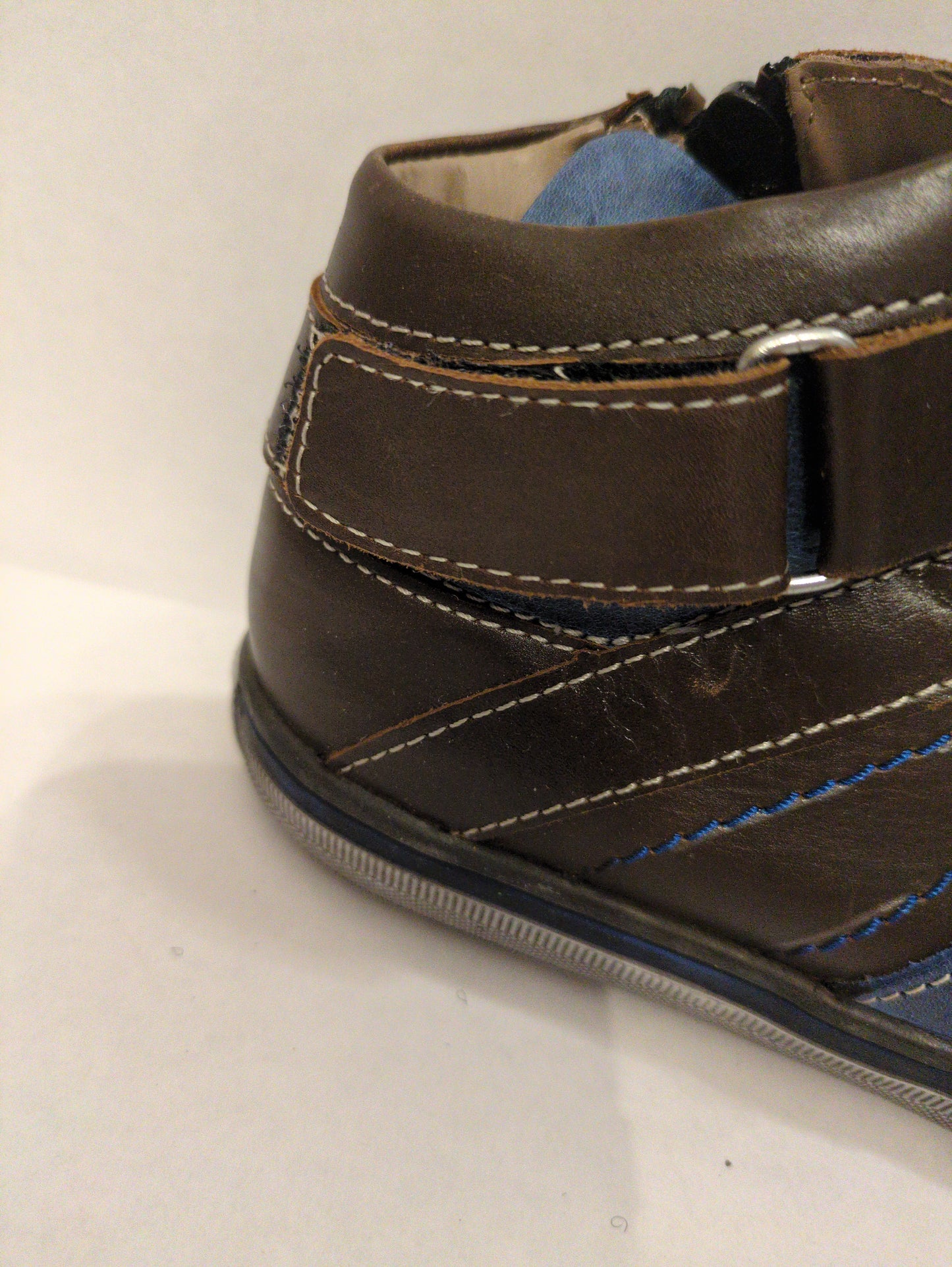 Bellamy Twix, Boys ankle boot in Dark Brown and bright blue leather. Blue laces and zip fastening boot.