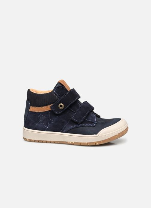 Bopy Vrouvel, boys casual boot in navy nubuck leather and suede with tan detailing on the tongue and side, which also features a star stitched into it. Double velcro fastening with a padded collar for an easy on secure fit, on a contrasting cream sole with rubber toe bumper for extra protection from scuffs and scrapes.