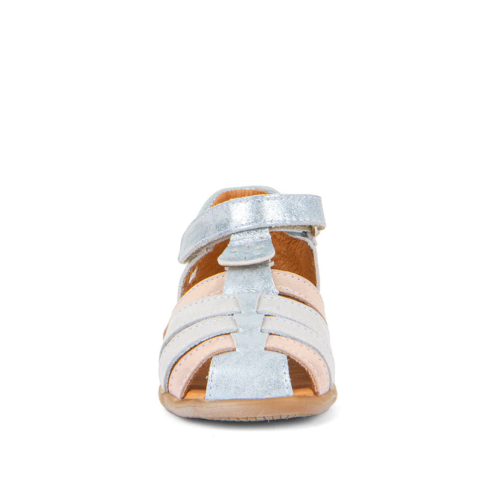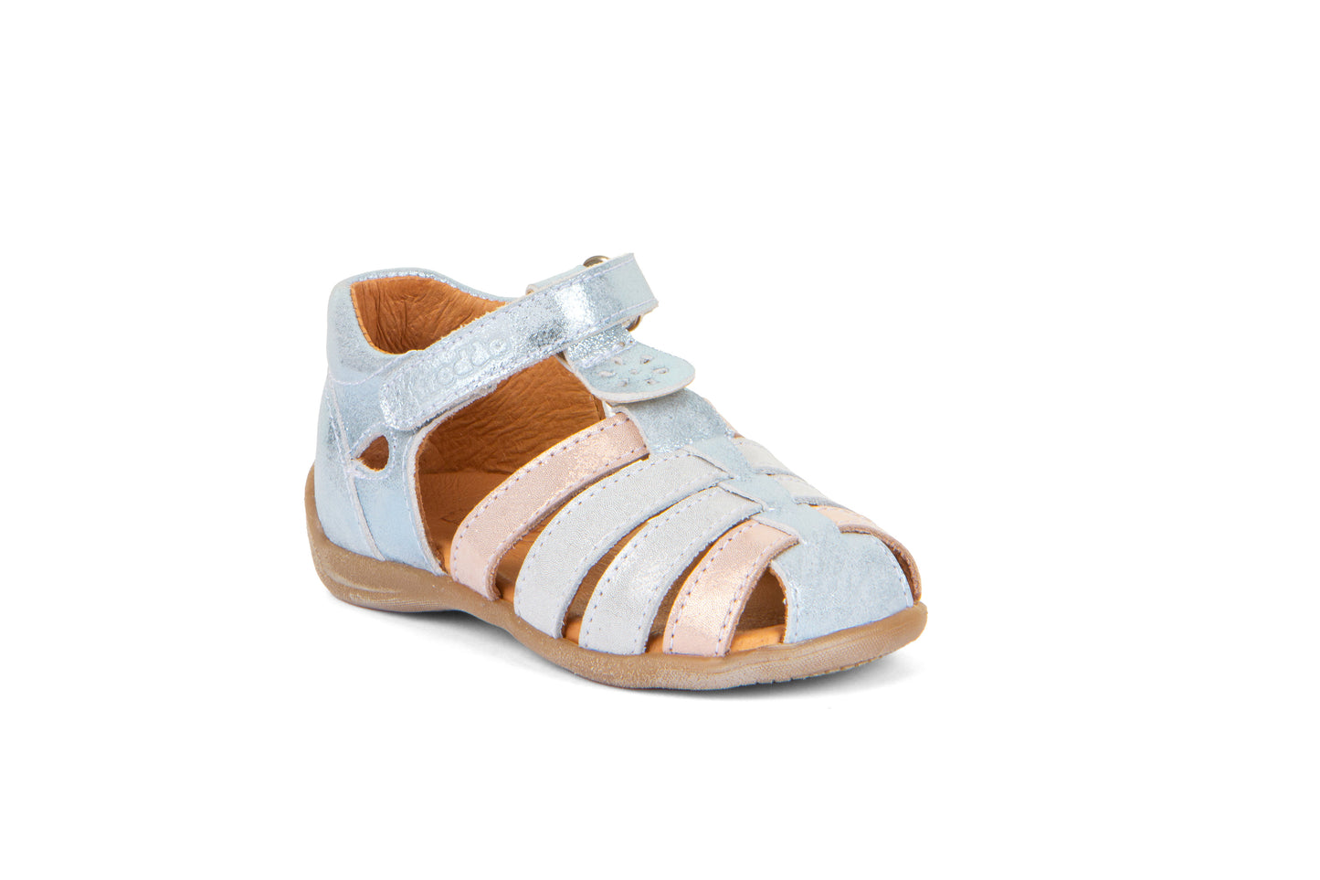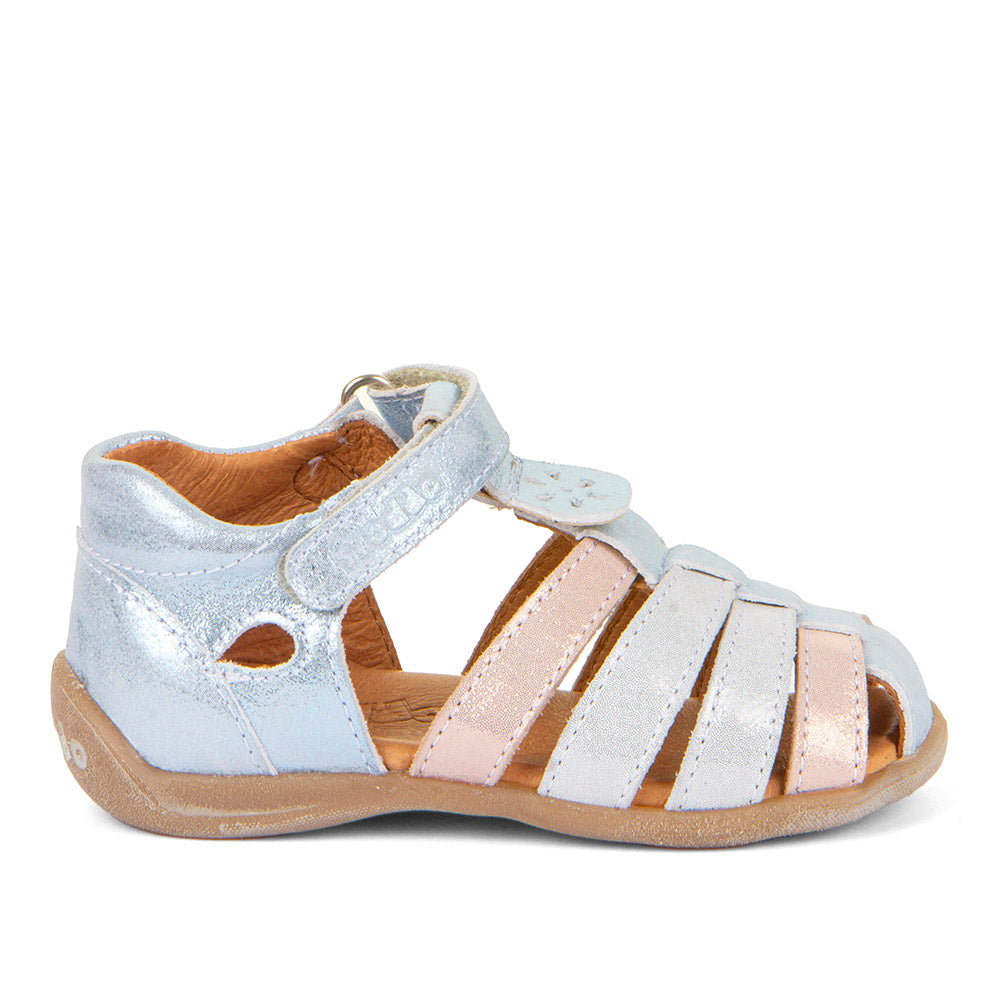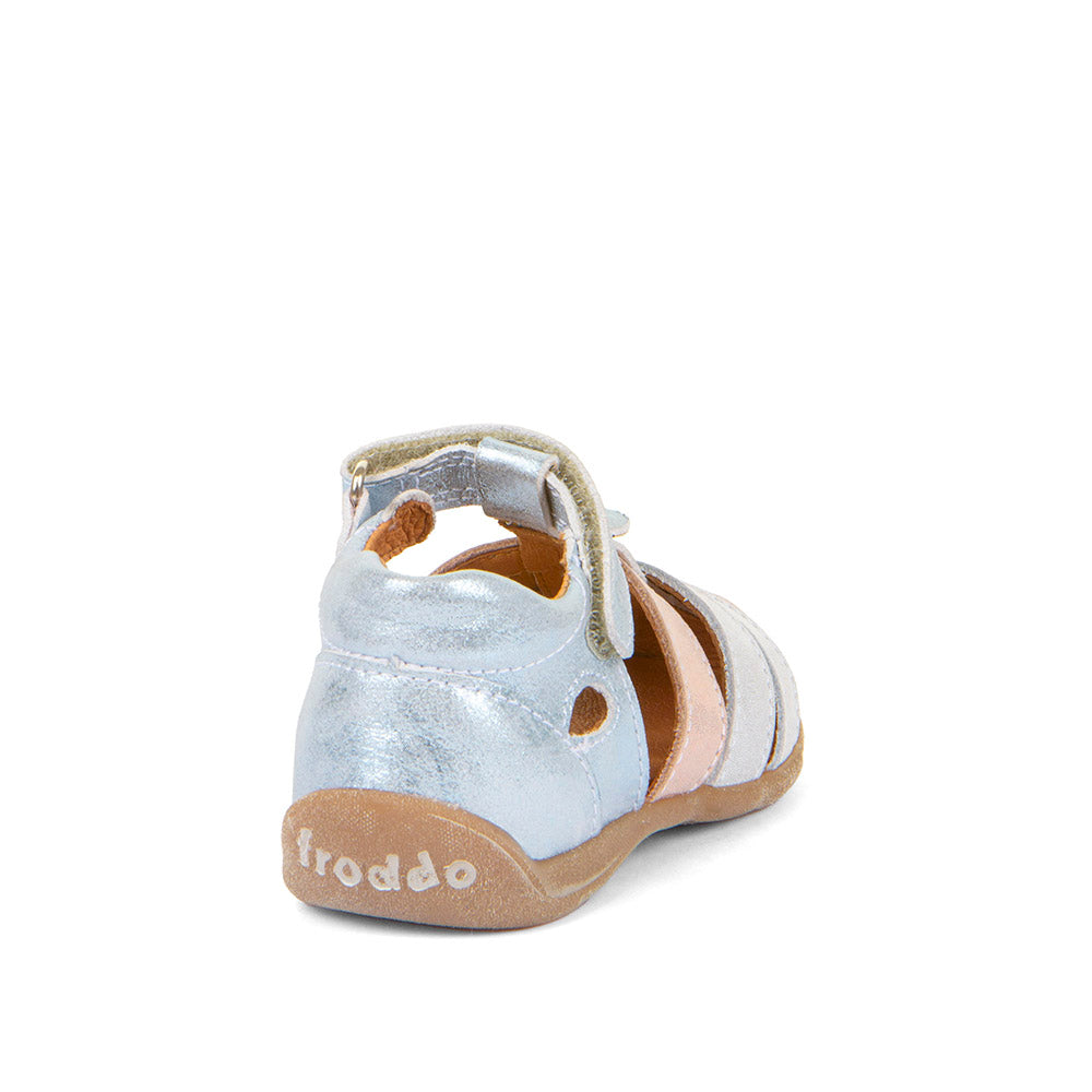 Froddo Carte Girly, shimmery leather closed toe sandal in ice blue with pink and silver straps, with punched out flower detail on the tab.