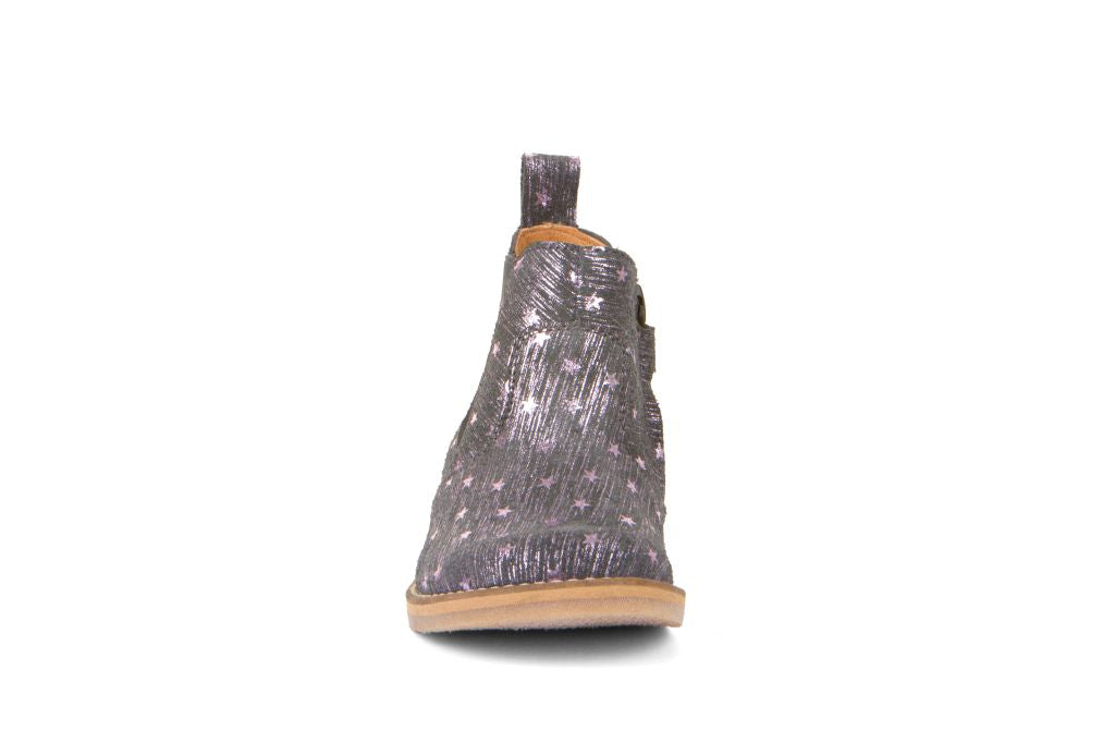 Froddo Chelys Low, modern girls Chelsea boot in grey suede with a metallic pink star print. There is an inside zip and matching grey gusset to help ease the foot in.