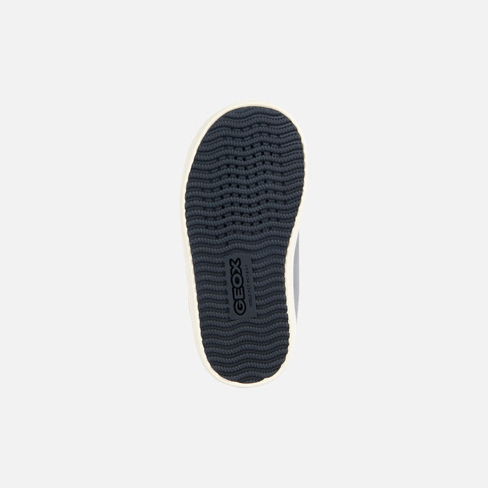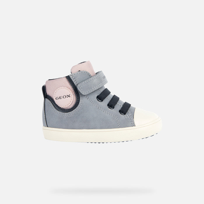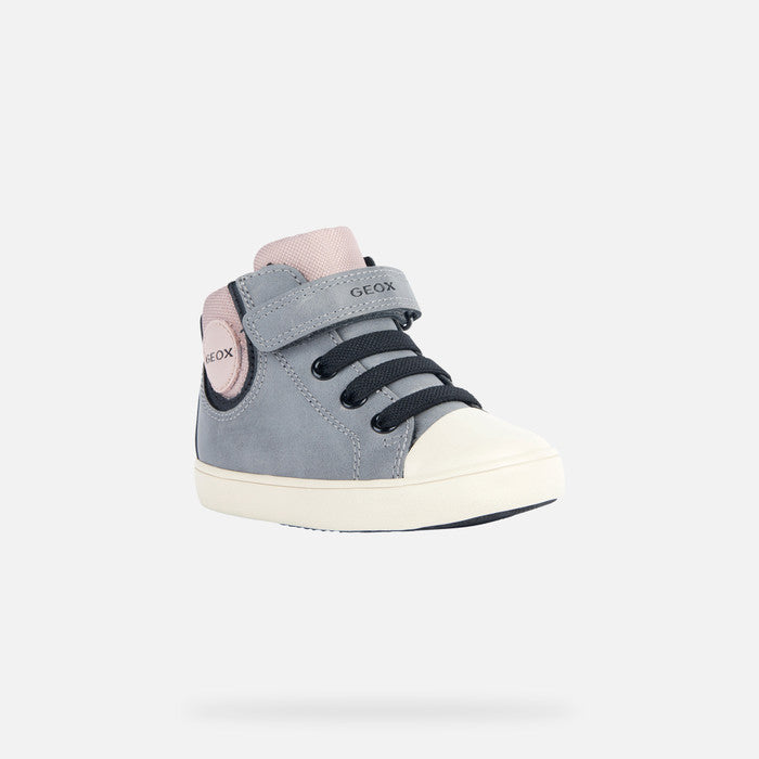 Geox B Gisli G, infant girls casual Hi-top in grey with contrasting pink collar and tongue with Geox logo on a cream sole. Velcro fastening with black bungee laces and a padded collar for an easy on, secure fit, rubber toe bumper for extra protection. Featuring Geox's unique breathable technology and a comfortable removable insole.