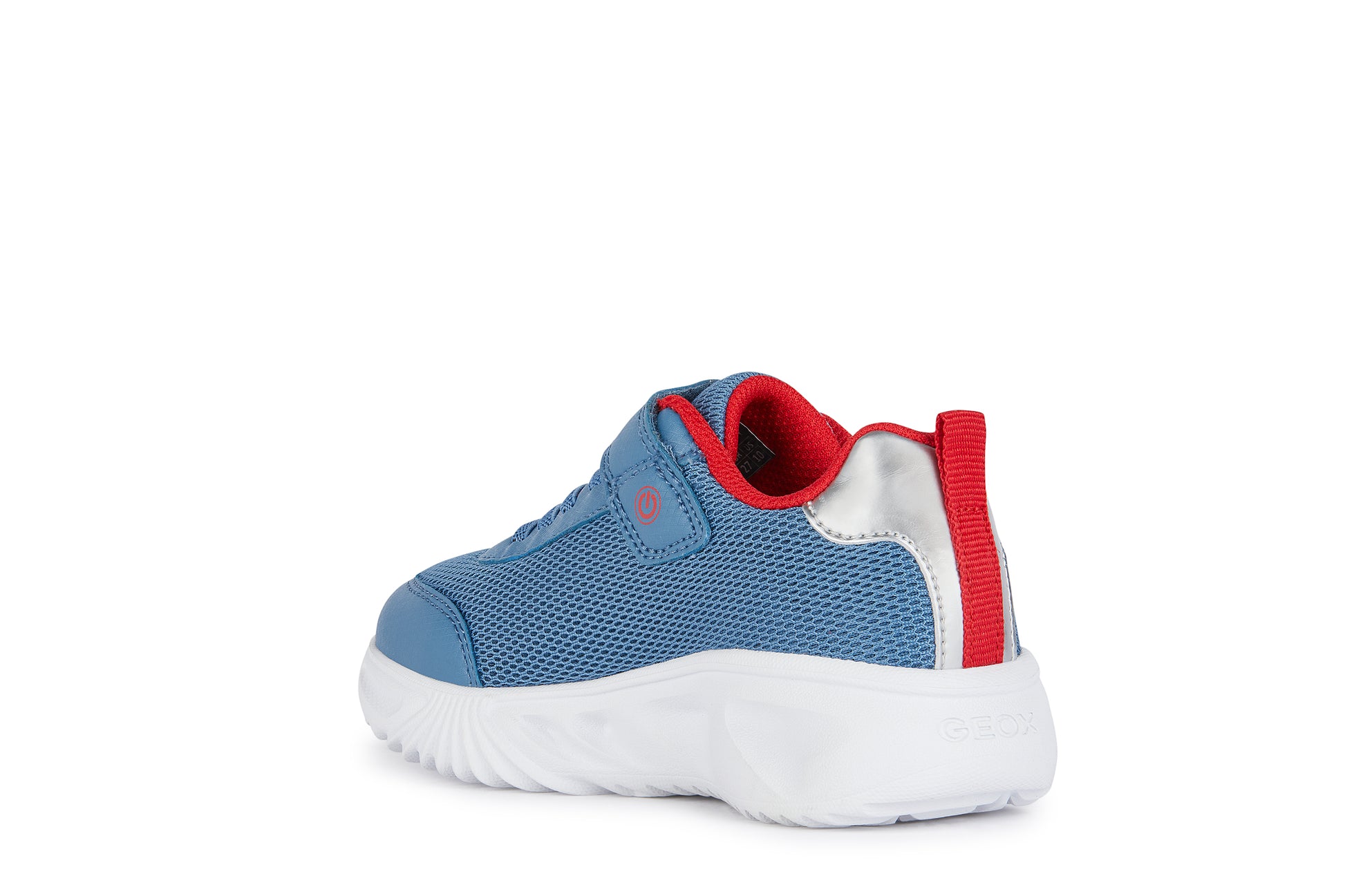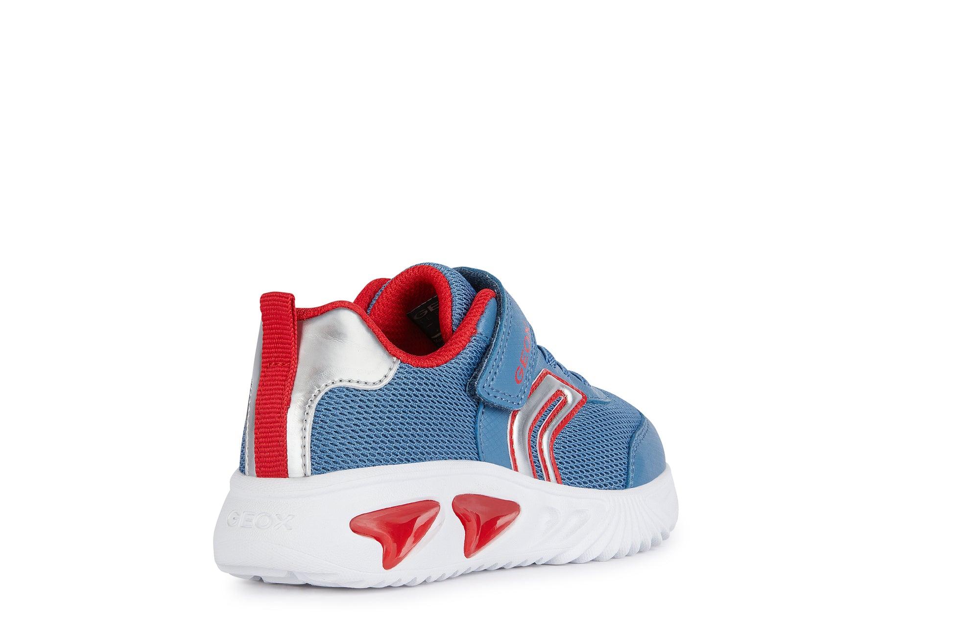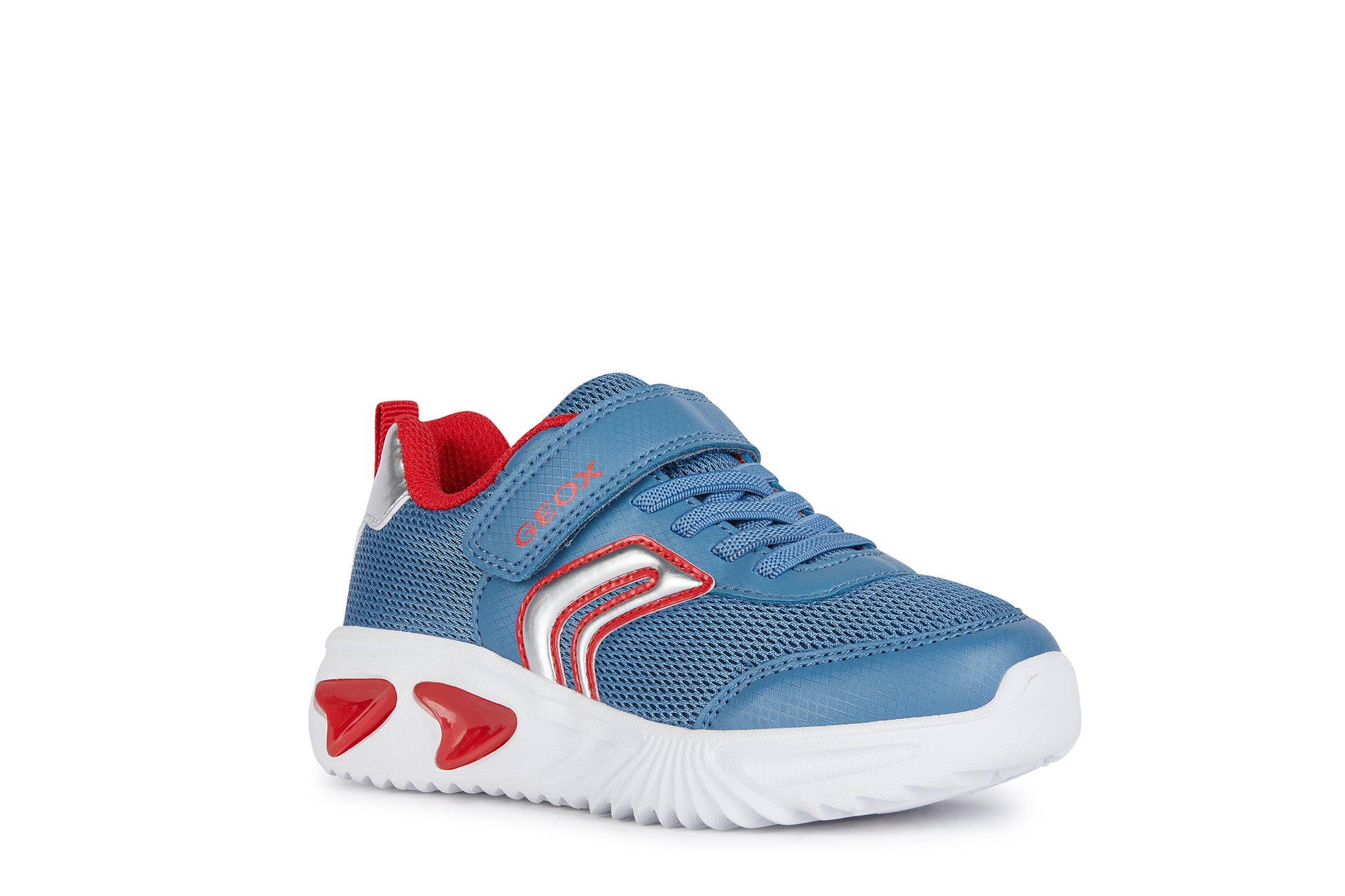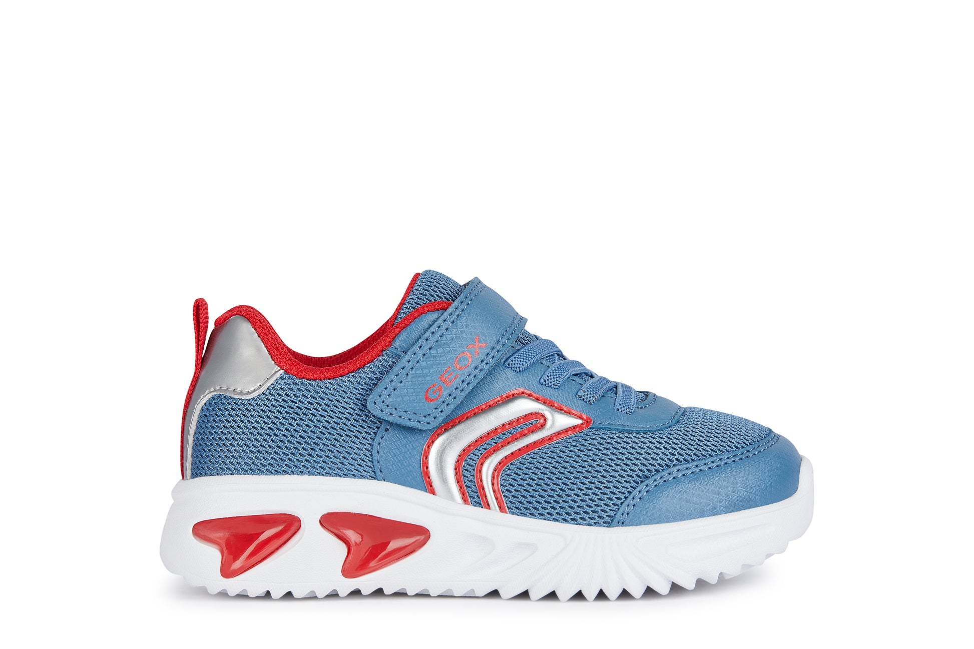 Geox J Assister B, a boys trainer in blue with silver trim and contrasting red to the upper, Geox logo and lining .On a chunky white LED light up sole with on/ off button, Assister has a velcro fastening with bungee laces for an easy on fit. Featuring Geox's breathable technology and a comfortable removable insole.