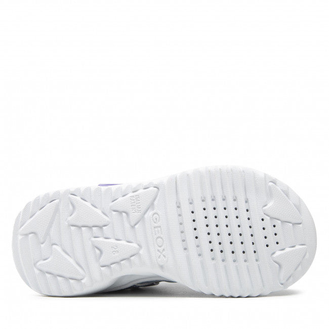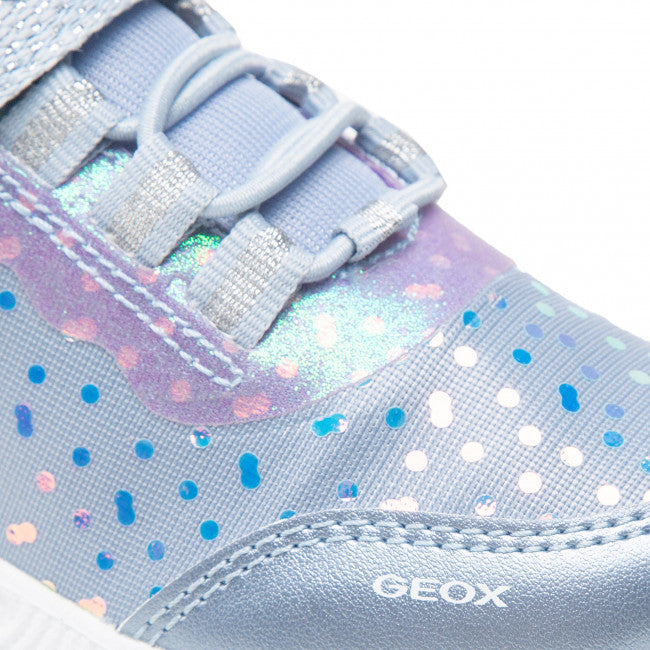 Geox J Assister G, girls trainer in a beautiful silvery blue with shimmery iridescent print on the upper and purple Geox logo and lining. On a chunky white LED light up sole with on/ off button, Assister has a velcro fastening with bungee laces for an easy on fit. Featuring Geox's breathable technology and a comfortable removable insole.