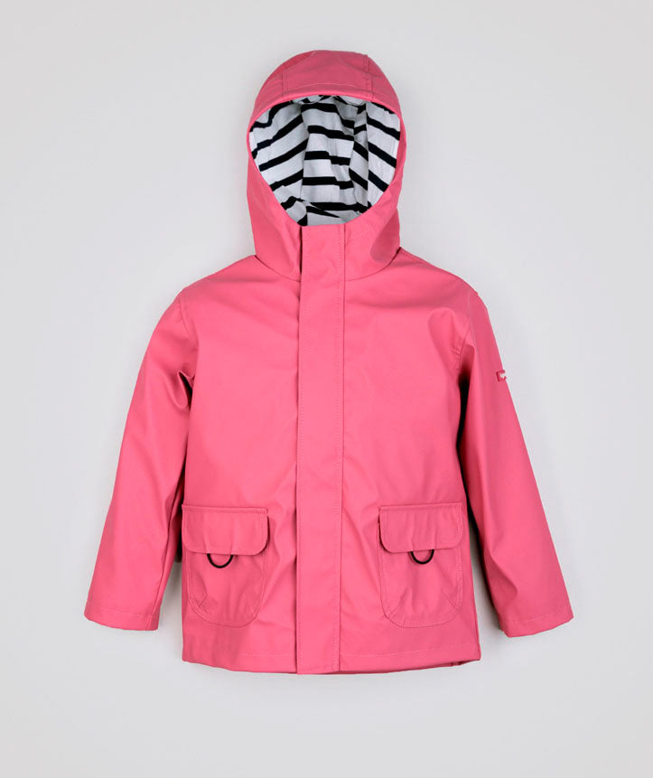 Classic waterproof raincoat with pockets in front collar and inner lining of striped cotton. Featuring concealed zip fastening with double stitched seams. Machine wash inside out. Use cold water and programme for delicate garments, gentle spin. Do not use tumble dryer.