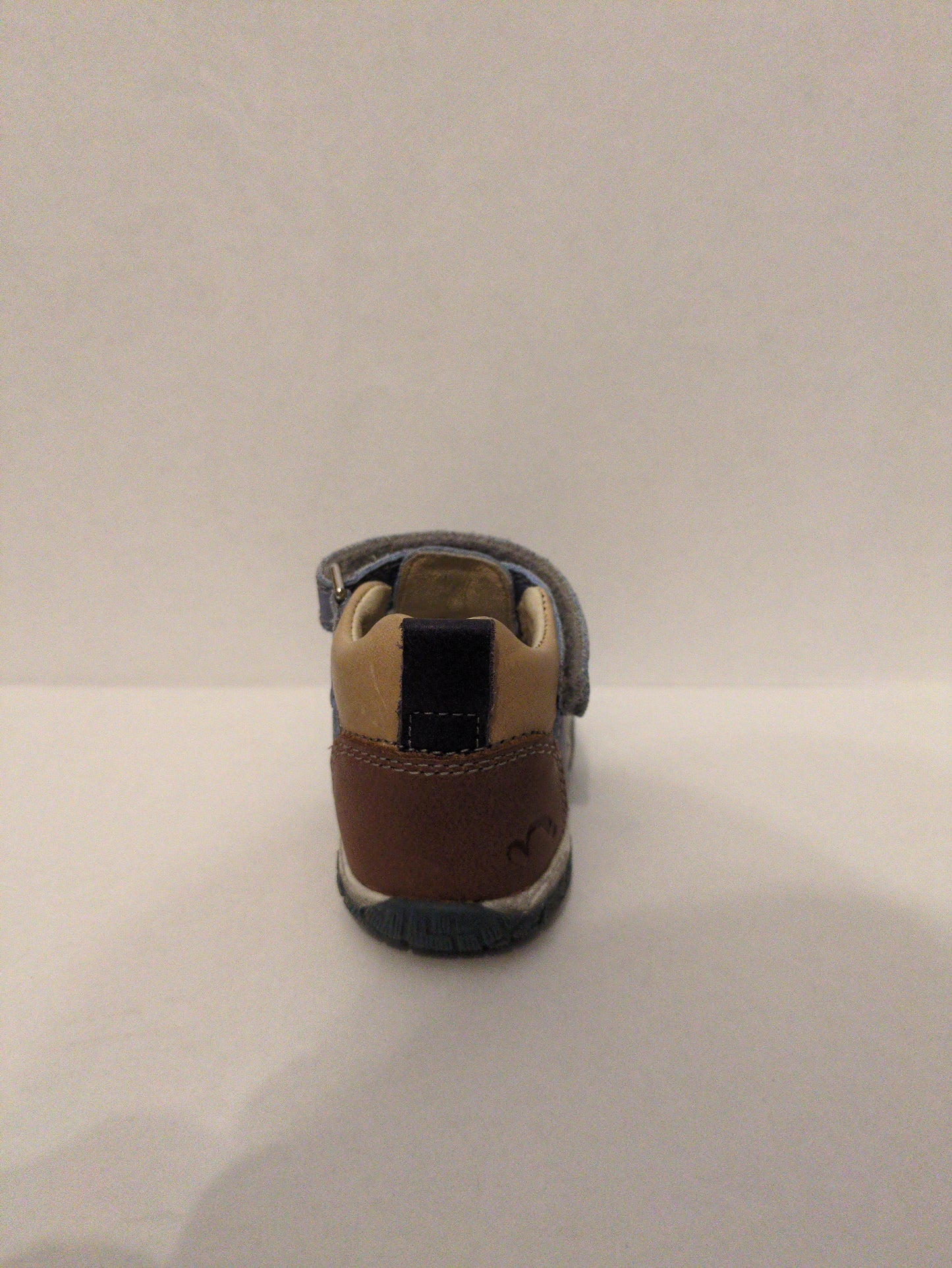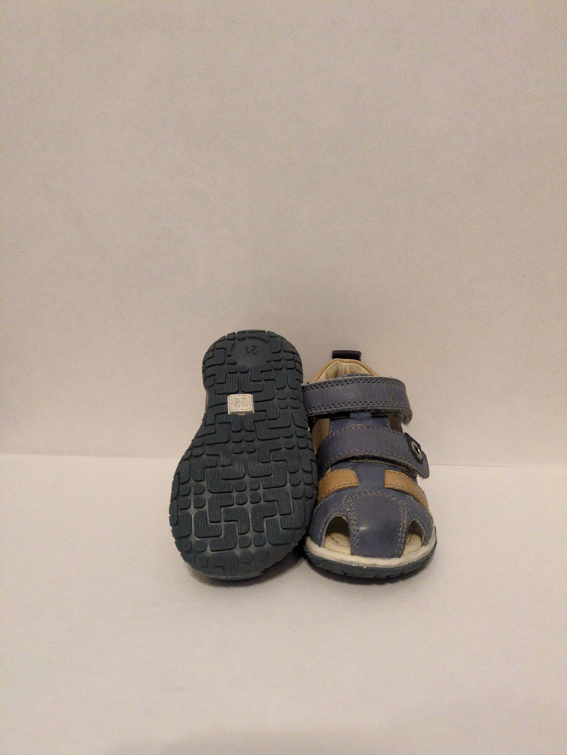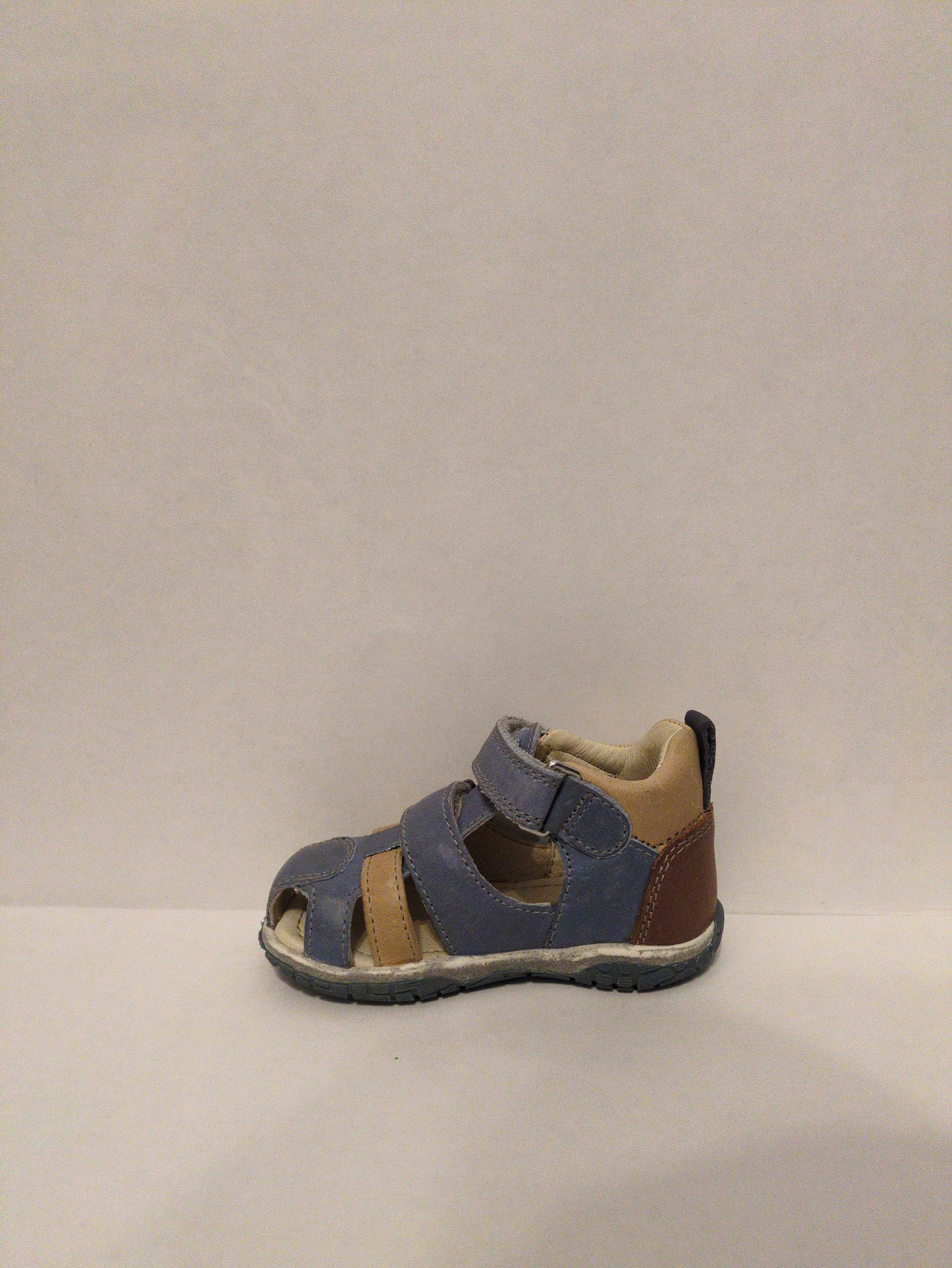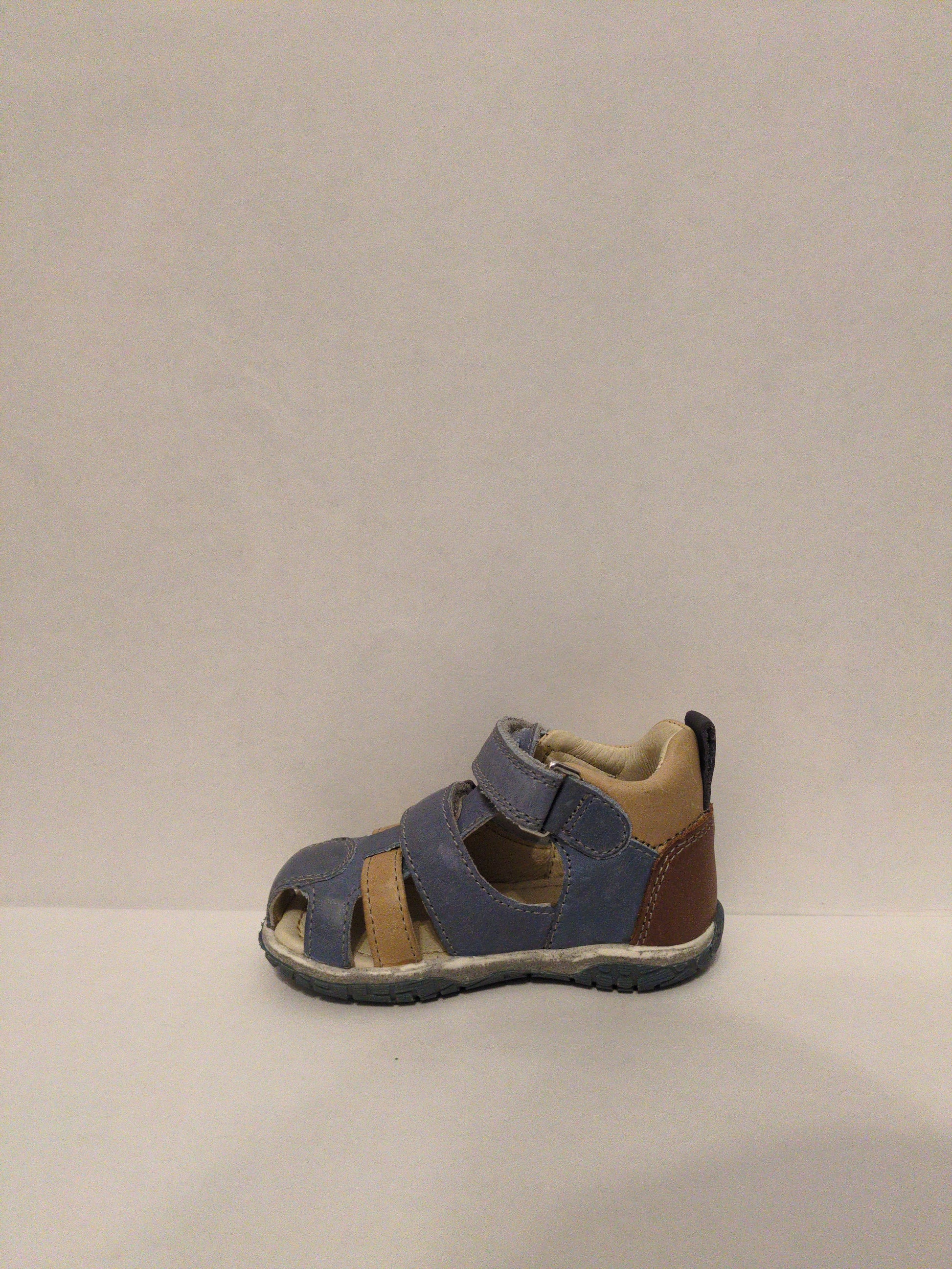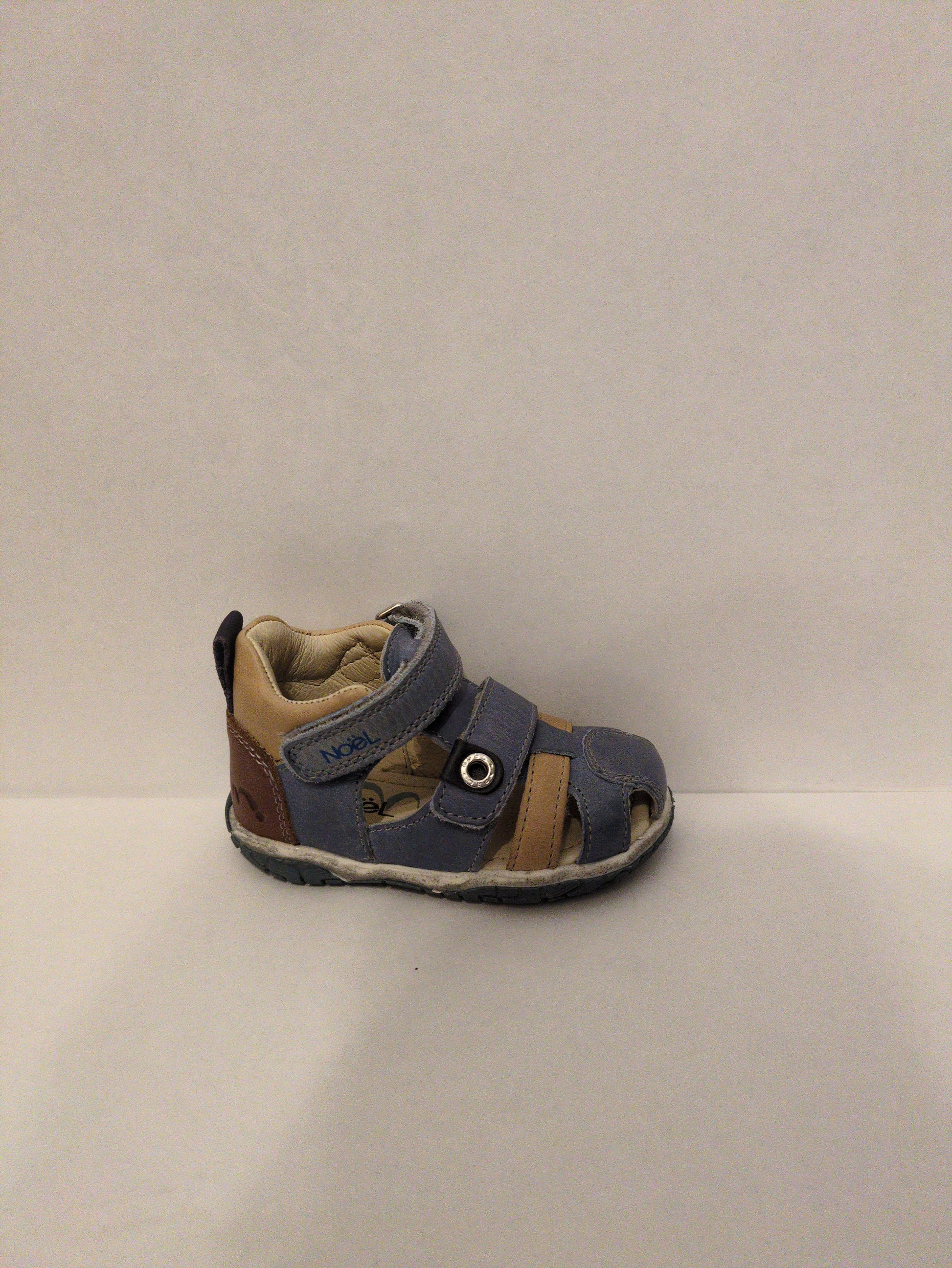 Noel Tai, boys closed toe sandal, in denim blue with beige accents, and a brown heel. Double velcro fastening.