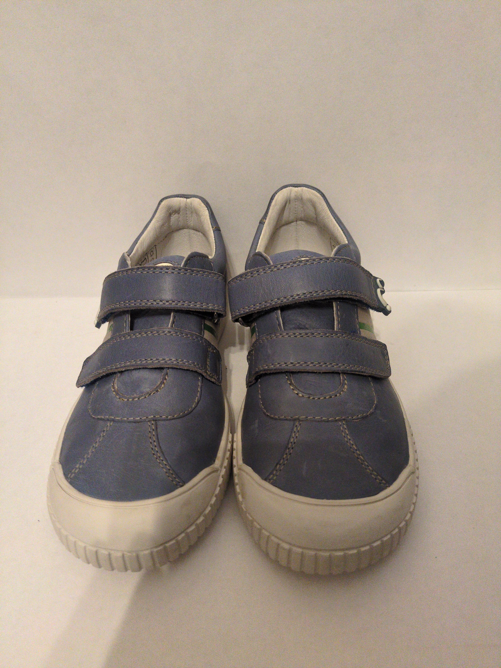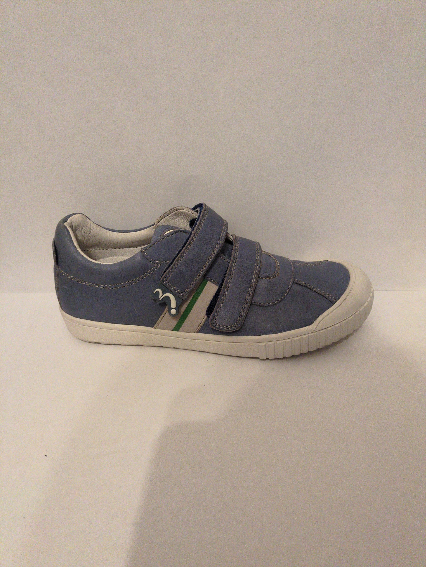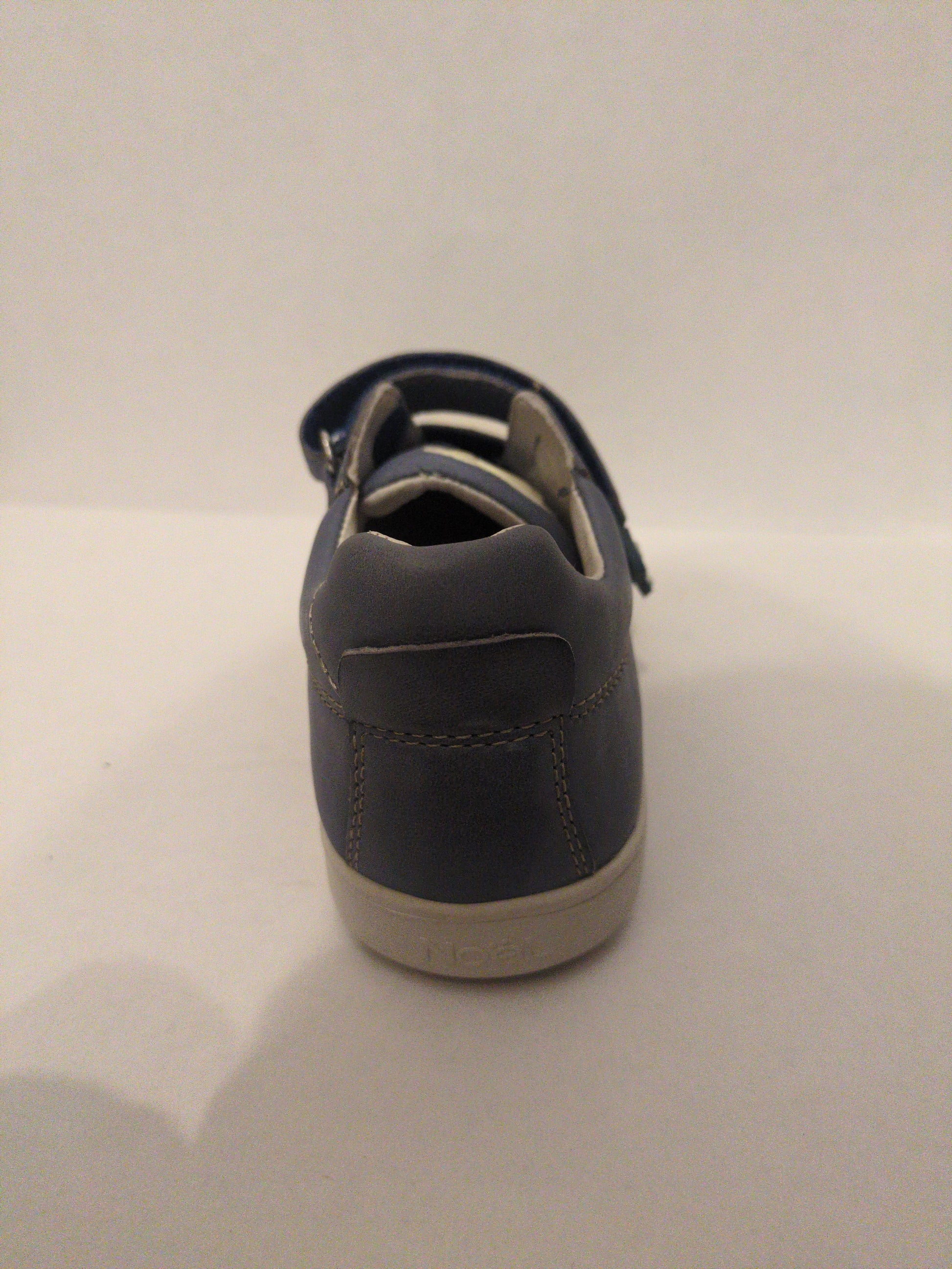 Noel Denim and white velcro fastening trainer, in leather with an added toe bumper.