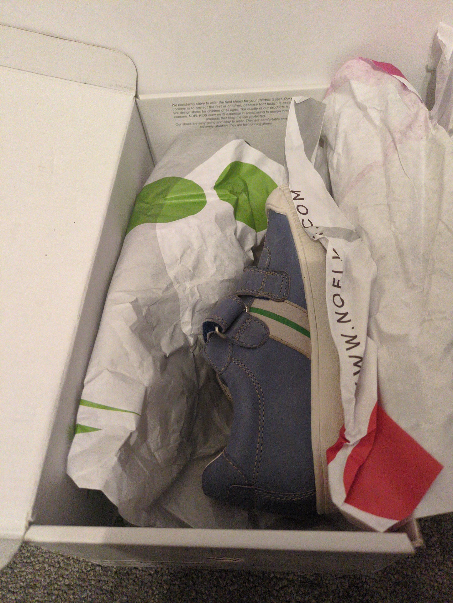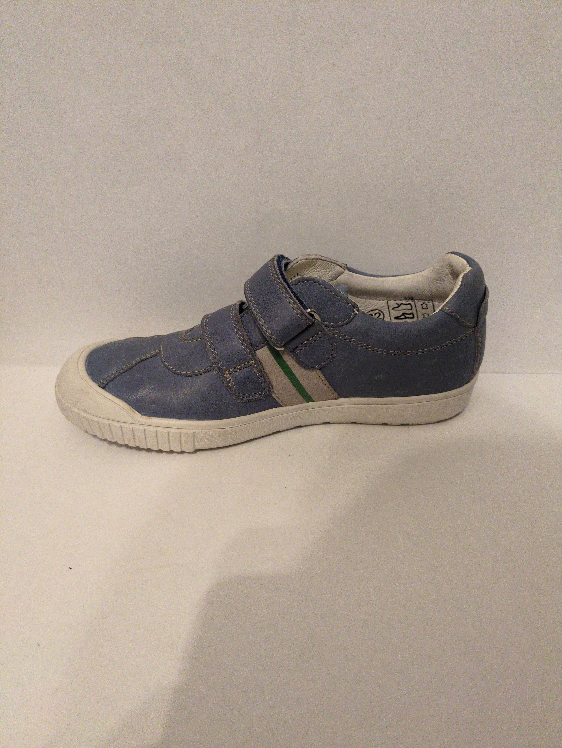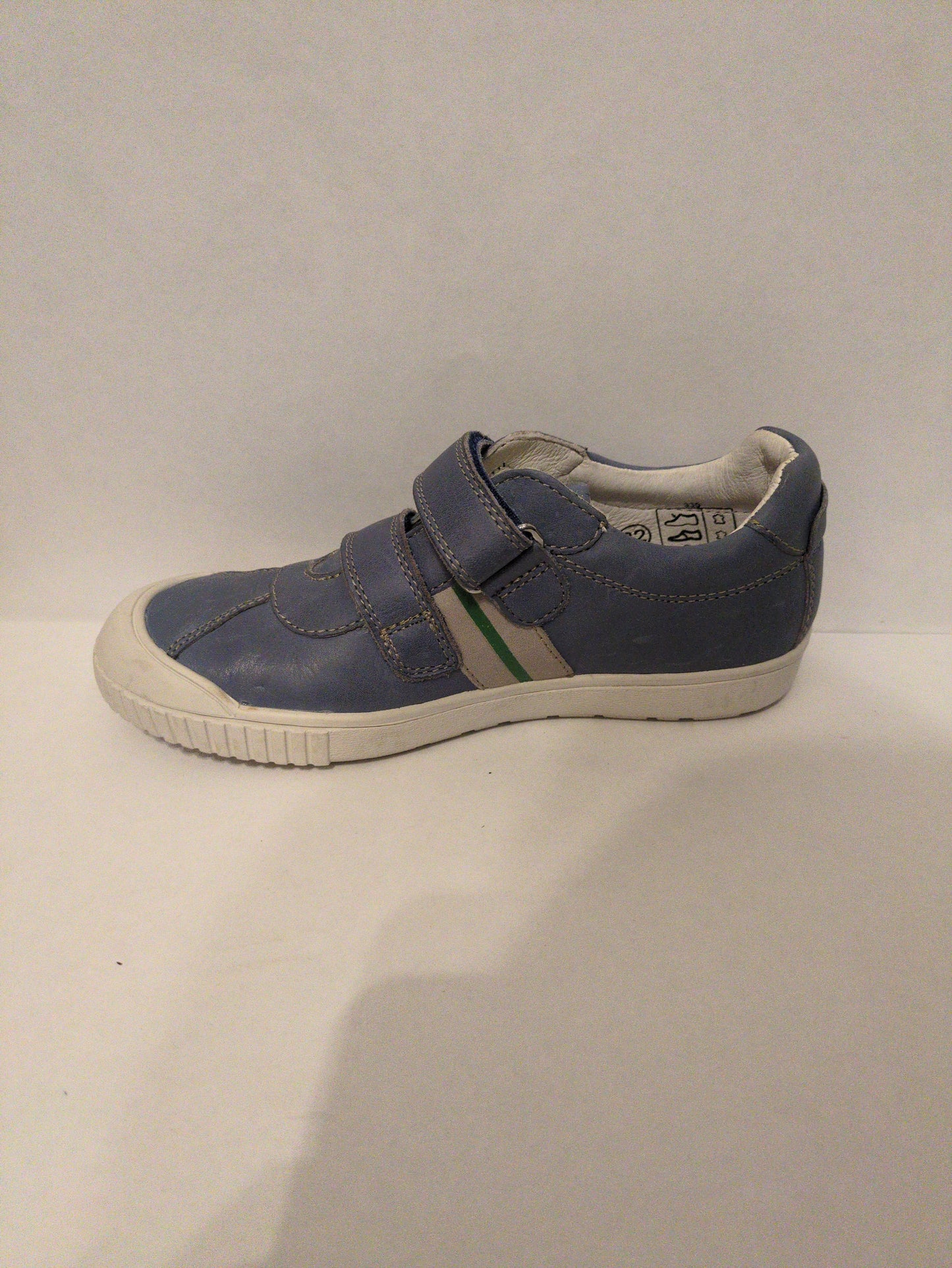 Noel Denim and white velcro fastening trainer, in leather with an added toe bumper.