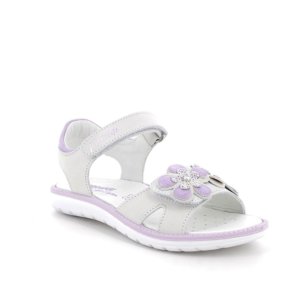 Primigi Alanis, a pretty girls sandal in white with lilac trim and flower detail.