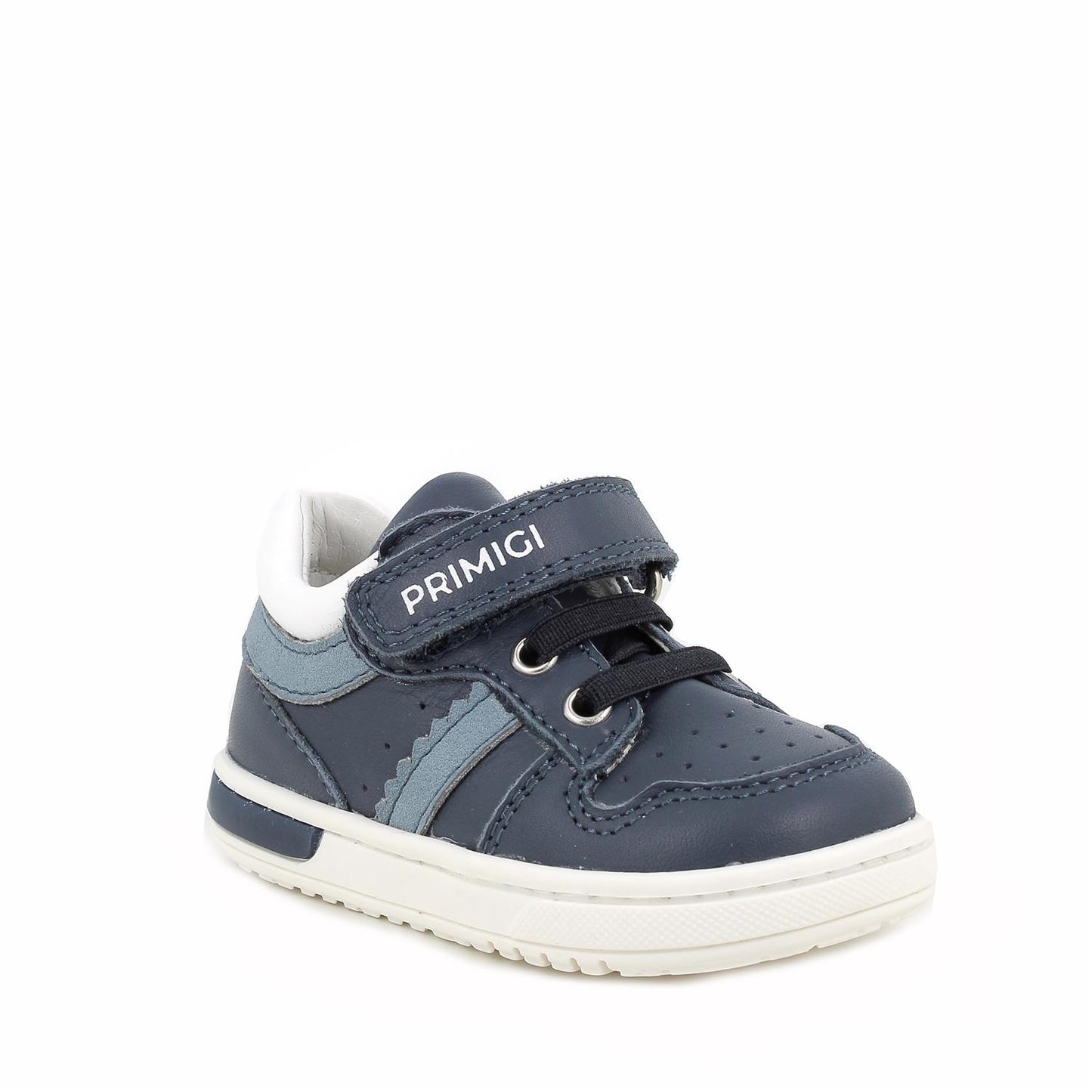 Primigi Baby Dude, a casual trainer shoe in navy blue leather with pale blue and white sporty trim, featuring the Primigi logo on the strap.