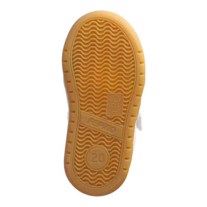 Ricosta Dakota is a trendy girls’ low-top sneaker in stone nubuck and white leather, featuring pink and yellow detailing.