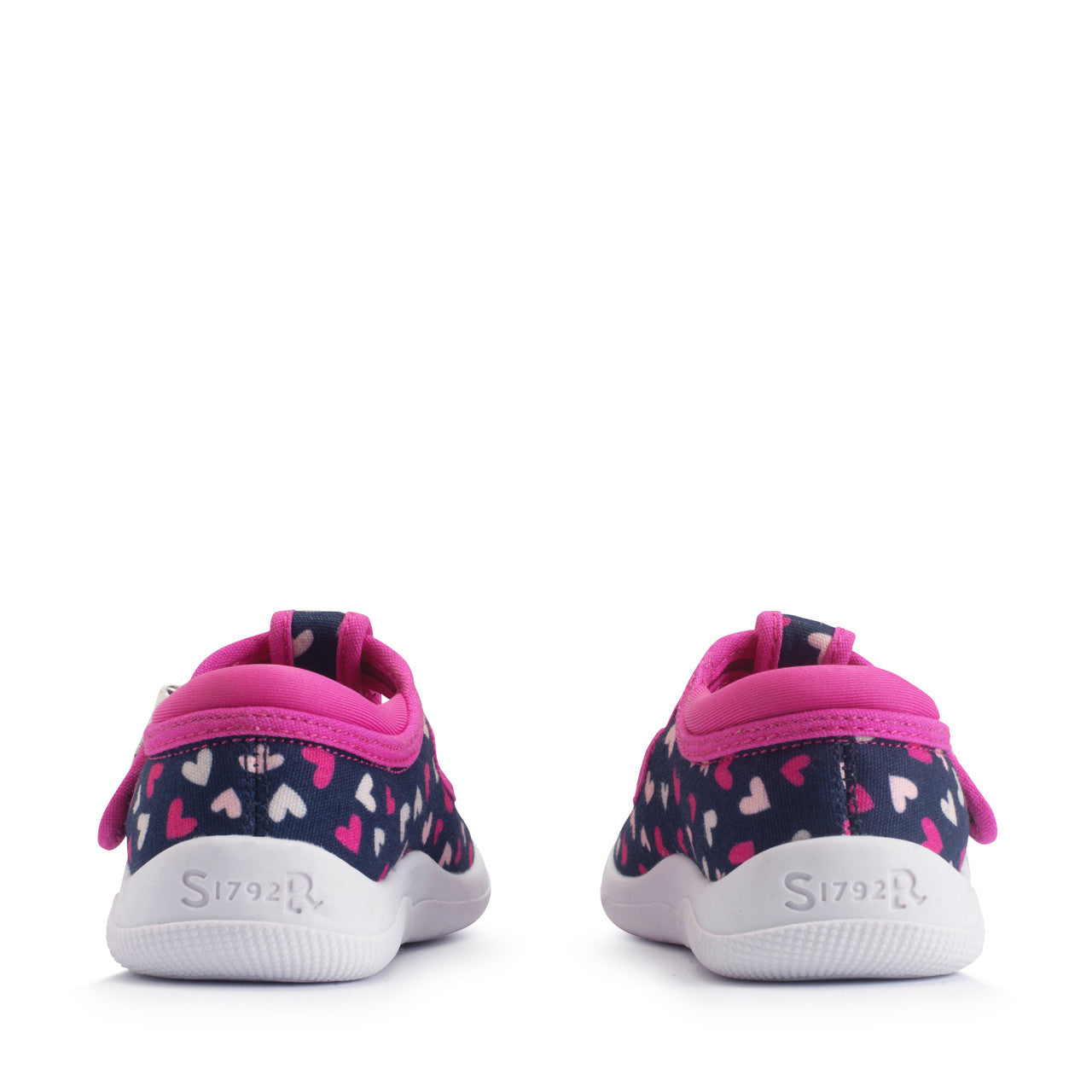 Start-Rite Wriggles , a T-bar canvas shoe in navy with pink heart print with a buckle fastening featuring the Start-Rite twins logo.
